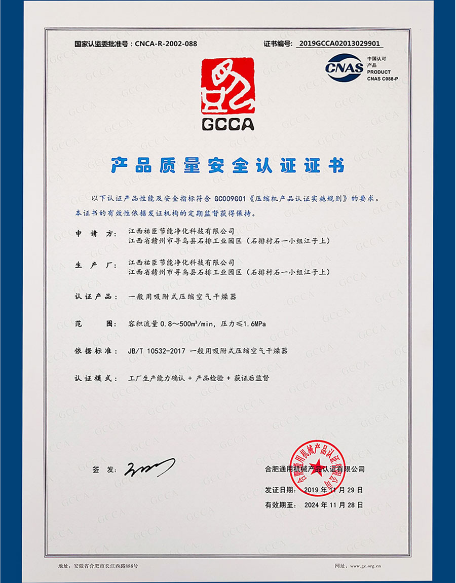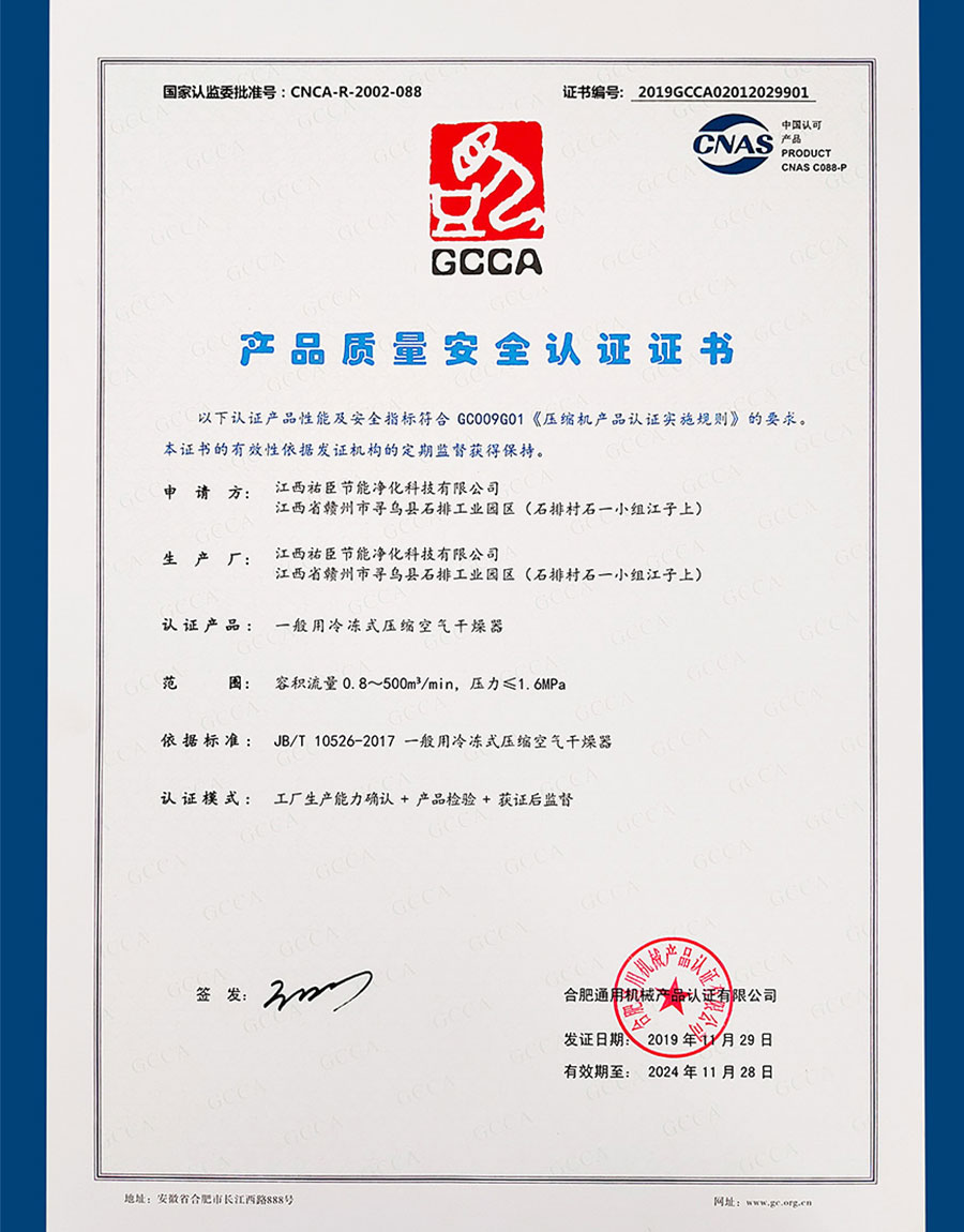 冷干机产品质量安全证...